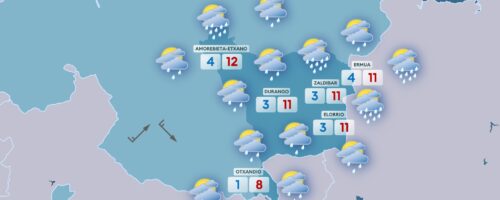 EGURALDIA | Aldaketa gutxi larunbaterako. Goi-hodeiak zeruan, tarteka ugariak, baina eguraldi eguzkitsua nagusi. Tenperatura minimoek gora egingo dute barnealdean, eta litekeena da izotza egitea; maximoak aurreko egunekoen antzekoak izango dira. Hego haizea; haizeak jo dezake arratsaldean kostaldean.