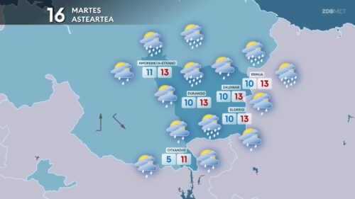EGURALDIA | Asteartean zerua lainotuta egongo da eta euri apur bat egingo du. Une jakin batzuetan argiuneak zabalduko dira, baina, oro har, hodeiek zerua estaliko dute. Gainera, euri pixka bat egingo du, batez ere egunaren bigarren partean, hego-ekialdeko haizeak ipar-mendebaldekoari paso eman ondoren. Tenperatura maximoek behera egingo dute eta beherakada hori Kantauri isurialdean nabariagoa izango da.