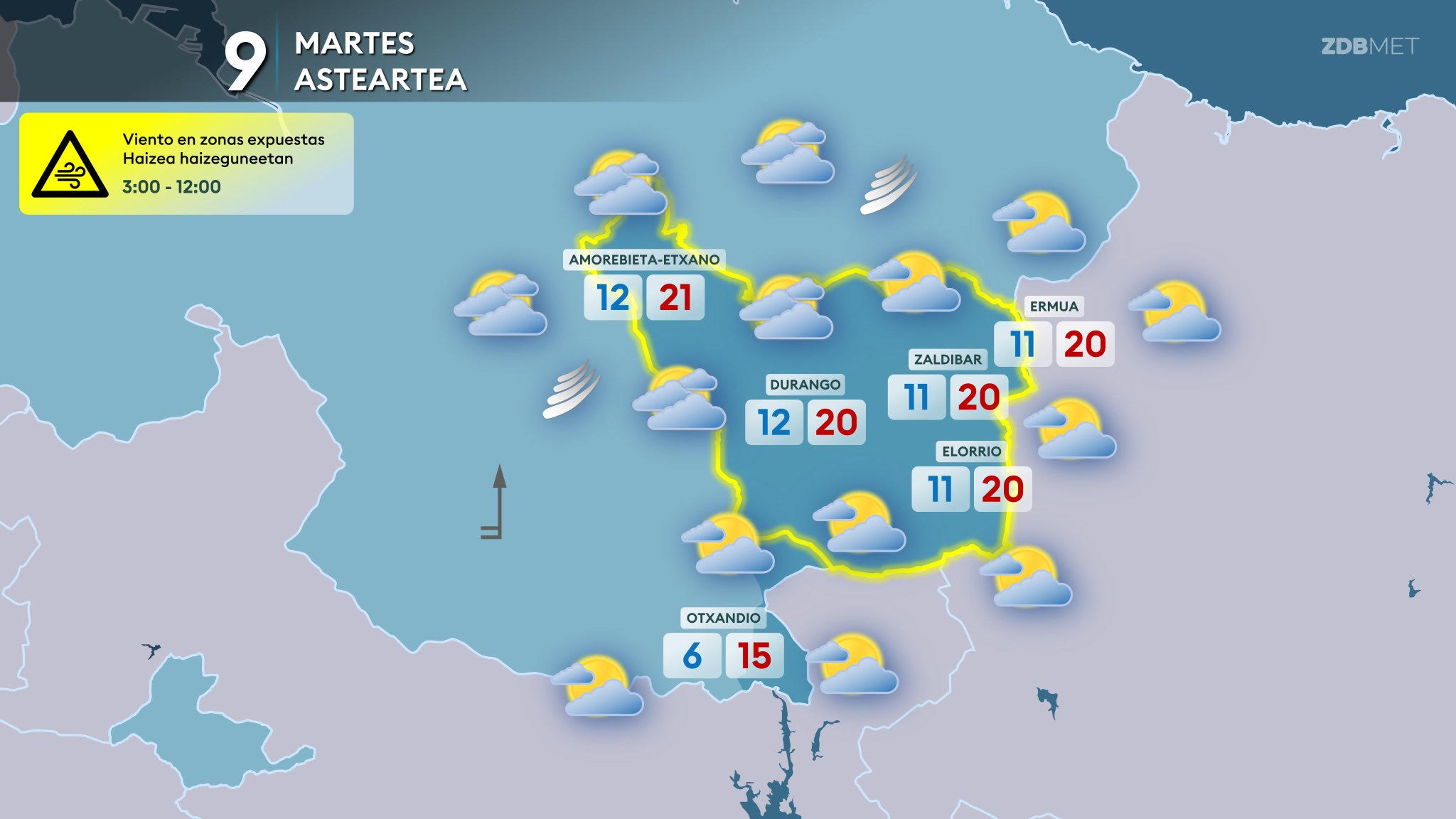EGURALDIA | Asteartean hego-haizea zakarra izango da, batez ere egunaren lehenengo partean; nonahi nabarituko dugu bere indarra, baina boladarik gogorrenak ipar-mendebaldeko haizeguneetan izango dira. Arratsaldean haizeak indarra galdu egingo du eta egunaren amaieran ahul ibiliko da. Egunaren hasieran zerua garbi egongo da; orduak pasa ahala hodeiak ugarituz joango dira, Kantauri isurialdetik hasita, eta egunaren amaieran zerua estalita egongo da denean. Arratsalde-gau partean han-hemenka euri txikia egin dezake, batez ere azken orduetan. Kantauri isurialdeko tenperaturak gora egingo du eta maximoak 20 ºC ingurukoak izango dira; hegoaldeko altuenetan aldaketa handirik ez.