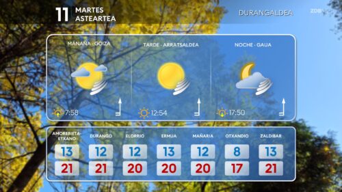 EGURALDIA | Asteartean hegoaldeko haizeak indar handiagoz joko du. Enbarazu egingo du une askotan, eta bolada gogorrak eta oso gogorrak neurtuko dira, batez ere mendi inguruetan. Giro eguzkitsua nagusituko da, erdi mailako hodei eta goi-hodei batzuekin goizean. Tenperaturak gora egingo du, eta Kantauri isurialdeko zenbait lekuetan gehiago nabarituko da, maximoak 20 ºC-tik gora geldituko baitira.