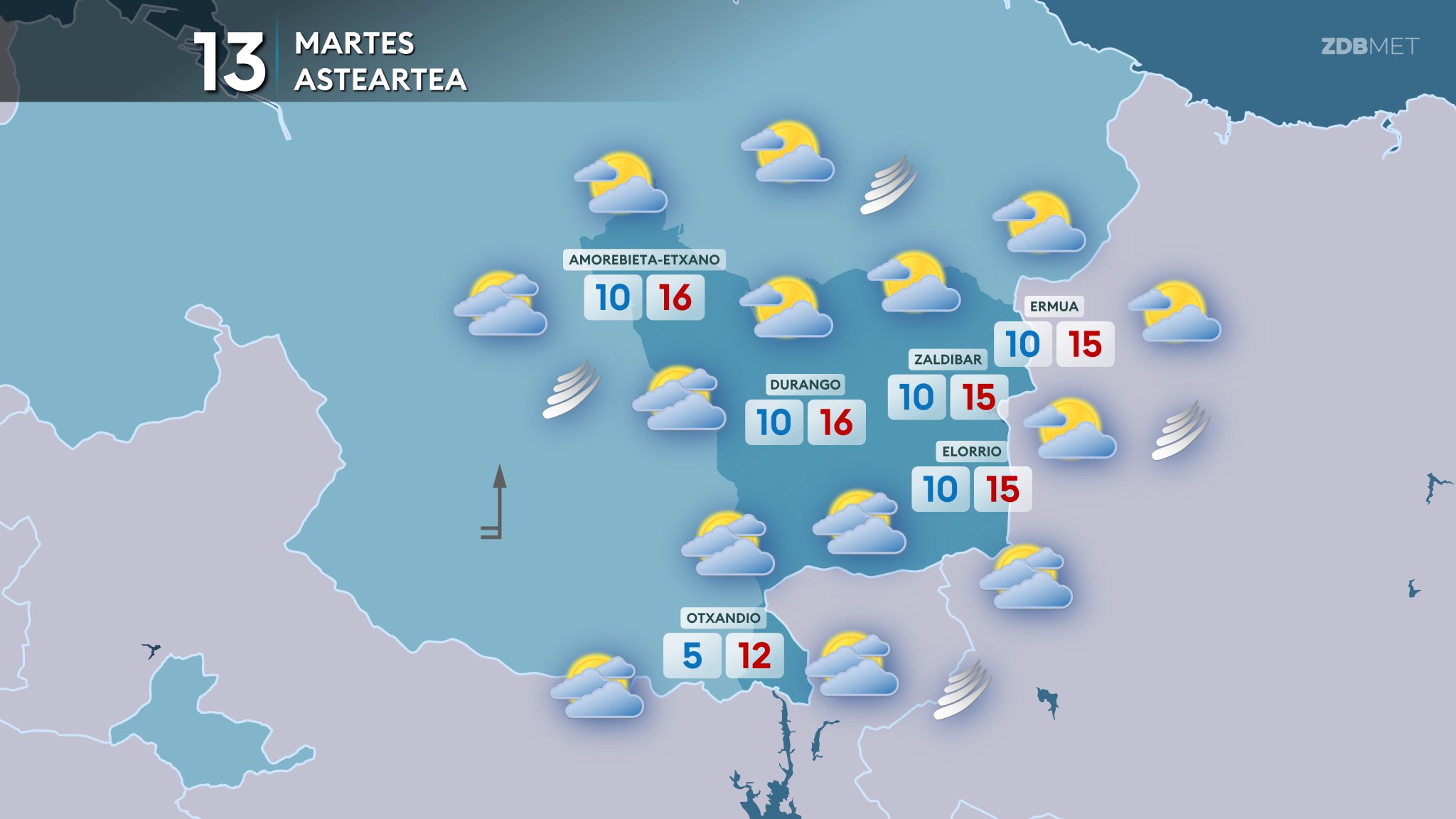 EGURALDIA | Asteartean eguraldiak berdintsu jarraituko du. Egunaren lehenengo partean zerua tarteka hodeitsu egongo da, erdi mailako hodeiekin eta goi-hodeiekin, eta ateri eutsiko dio. Arratsaldea aurrera joan ahala hodei trinkoagoak agertuko dira eta han-hemenka euri txikia egin lezake. Tenperaturak ildo beretik jarraituko du eta giroa epela izango da. Hego-haizea ibiliko da, bolada gogorrekin, batez ere egunaren lehenengo partean; eguerditik aurrera haizeak indarra galdu egingo du.