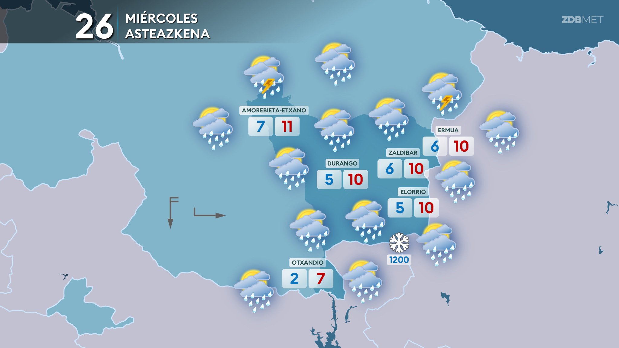 EGURALDIA | Asteazkenean zaparrada kontuekin jarraituko dugu, batez ere goizean. Eguerdira arte zaparrada giroa nagusituko da, batez ere ipar partean, eta goizaldean oraindik trumoi-ekaitzak jo eta txingorra ere egin dezake. Arratsaldeak aurrera egin ahala, euria modu ahulagoan egingo du eta aterruneak luzatuz joango dira. Haizea iparraldetik ibiliko da eta tenperatura zertxobait jaitsi liteke. Goizean goiz elur-kota 1000 m-ren bueltan kokatuko da baina arratsaldean igo egingo da.