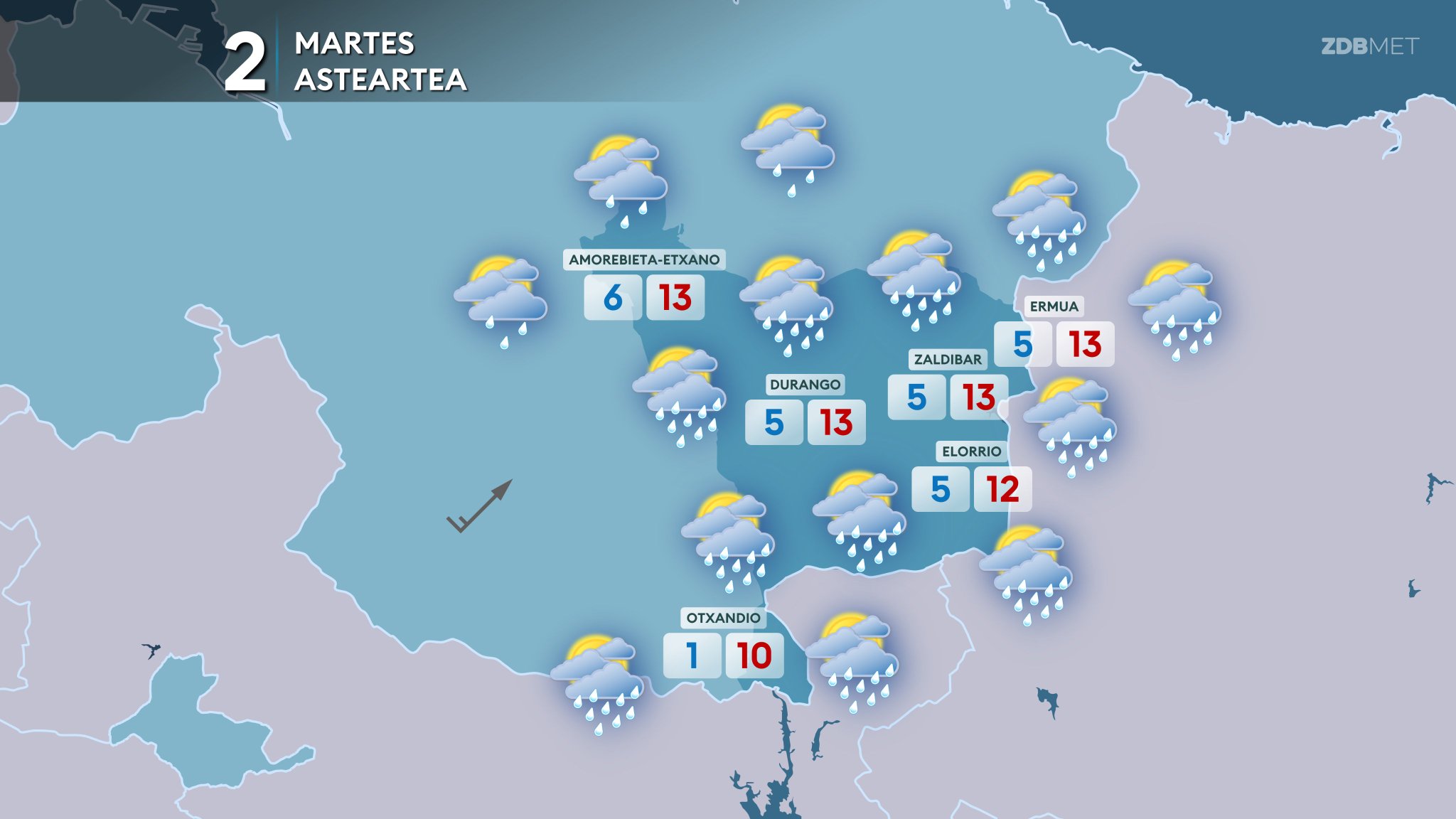 EGURALDIA | Goizaldean eta goizean goi euria ekarri digun frontea nahiko azkar pasatuko da eta, goizean bertan, mendebaldetik ekialdera, atertzera egingo du. Horrekin batera, ostarteak zabalduko dira. Gauzak horrela, eguneko ordu gehienetan ateri eutsiko dio. Mendebaldeko eta hego-mendebaldeko haizea ibiliko da eta tenperatura maximoak antzekoak edo pittin bat baxuagoak izango dira.