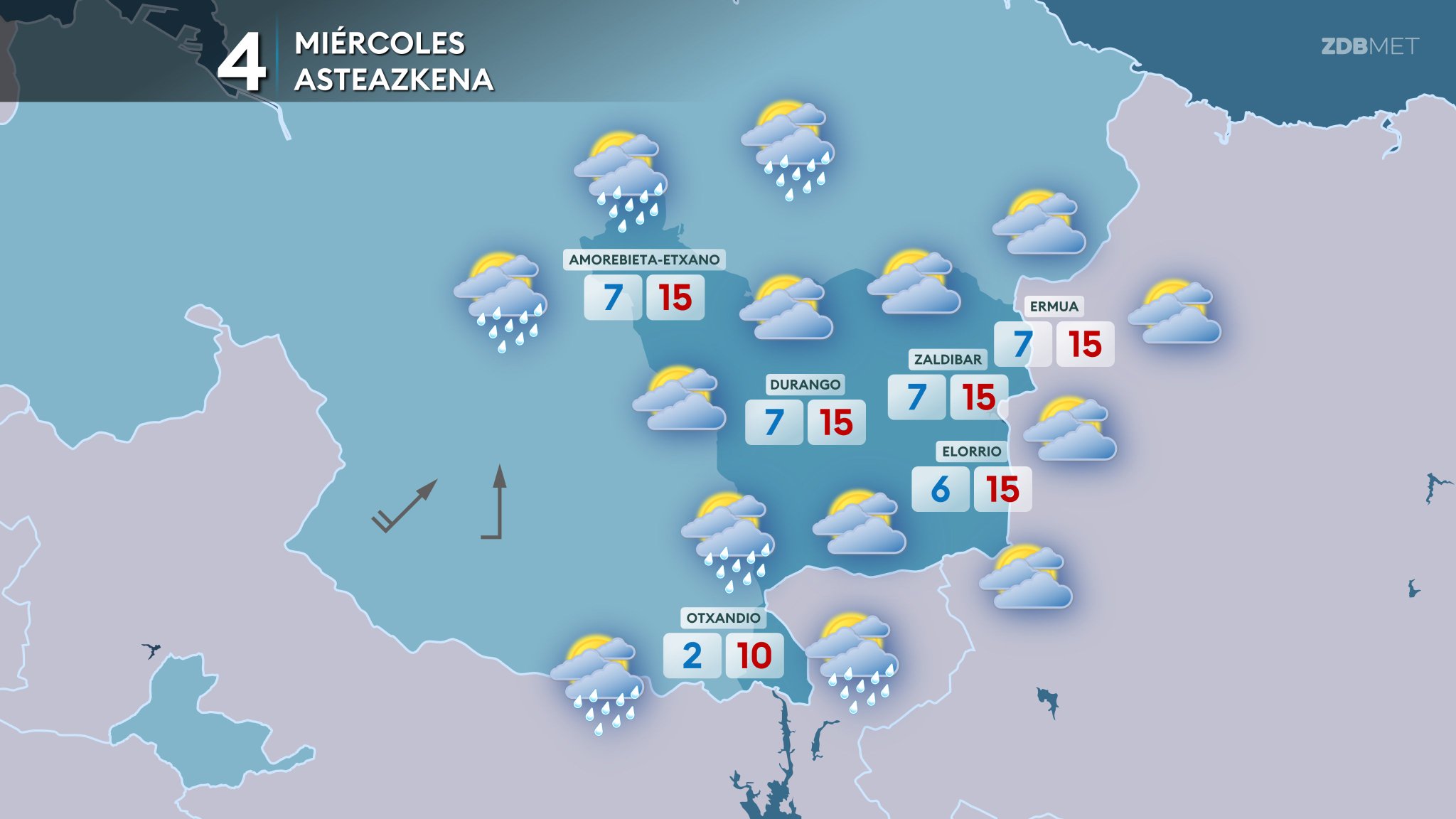 EGURALDIA | Asteazkenean hodeiak ugaritu eta zaparradak botatzeko probabilitatea areagotu egingo da. Hegoaldeko haizeak tarteka gogor joko du eta giro epelarekin jarraituko dugu. Hodeiak ugaritu egingo dira eta zaparradak egingo ditu, sarriago egingo du euria Araban eta Nafarroan. Elur-kota 1100-1300 metro inguruan egongo da.