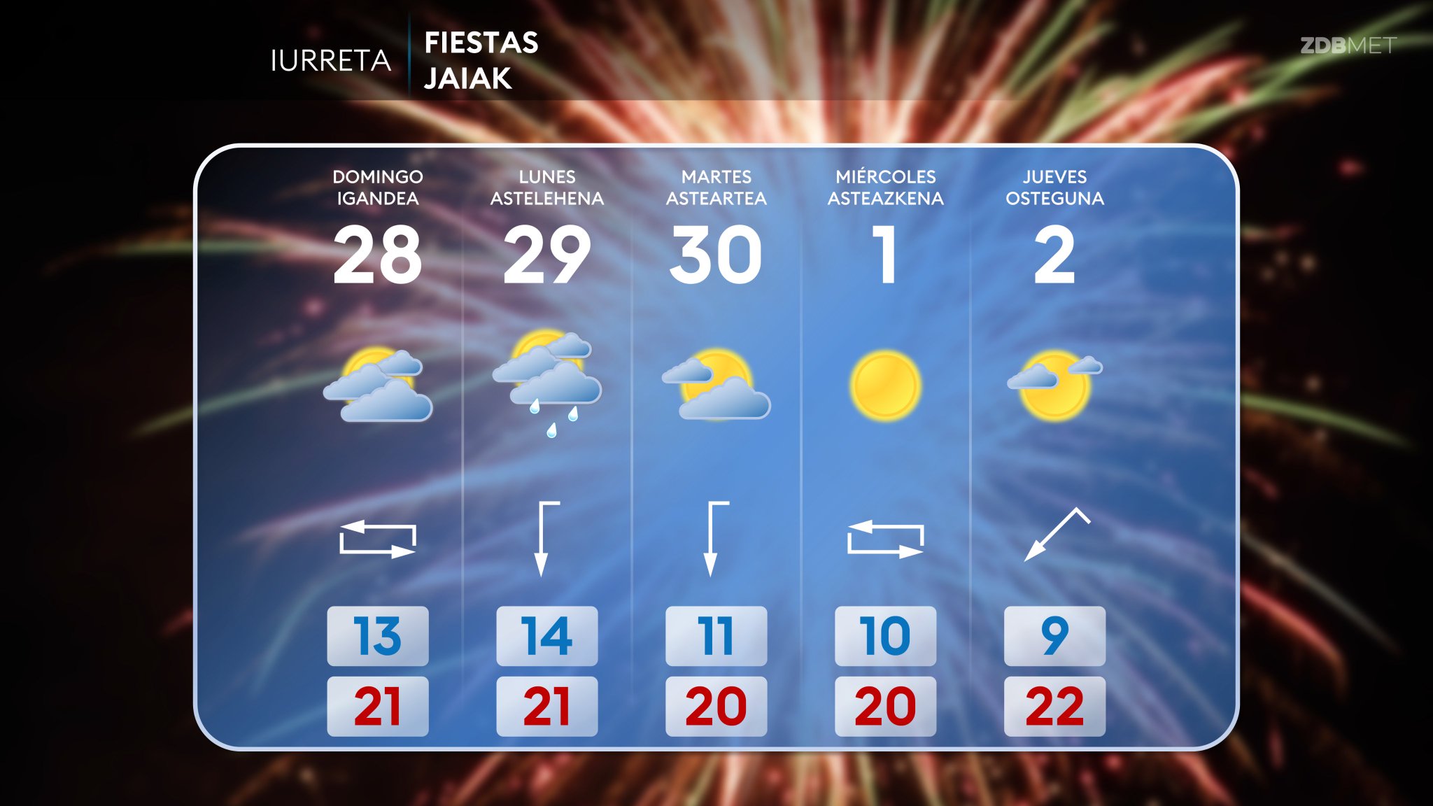 EGURALDIA | Gaur tenperatura maximoek behera egingo dute, eta hodeiak ostarteak baino gehiago izango dira zeruan. Termometroak ez dira aurreko eguneko balioetara iritsiko, eta 22-25 ºC inguruan mugituko dira. Arabako hegoaldean eta Nafarroako erdialdean eta hegoaldean maximoak antzekoak izango dira, eta zertxobait igoko dira. Zeruan hodei dezente izango ditugu, batez ere erdi-mailako hodeiak eta goi-hodeiak, eta tarteka ostarte batzuei bidea utziko dietenak. Baliteke azken orduetan zaparrada batzuk botatzea Araba eta Nafarroa hegoaldean eta trumoitsuak izan daitezke. Haizea ipar-mendebaldetik eta iparraldetik finkatuko da eguerditik aurrera.