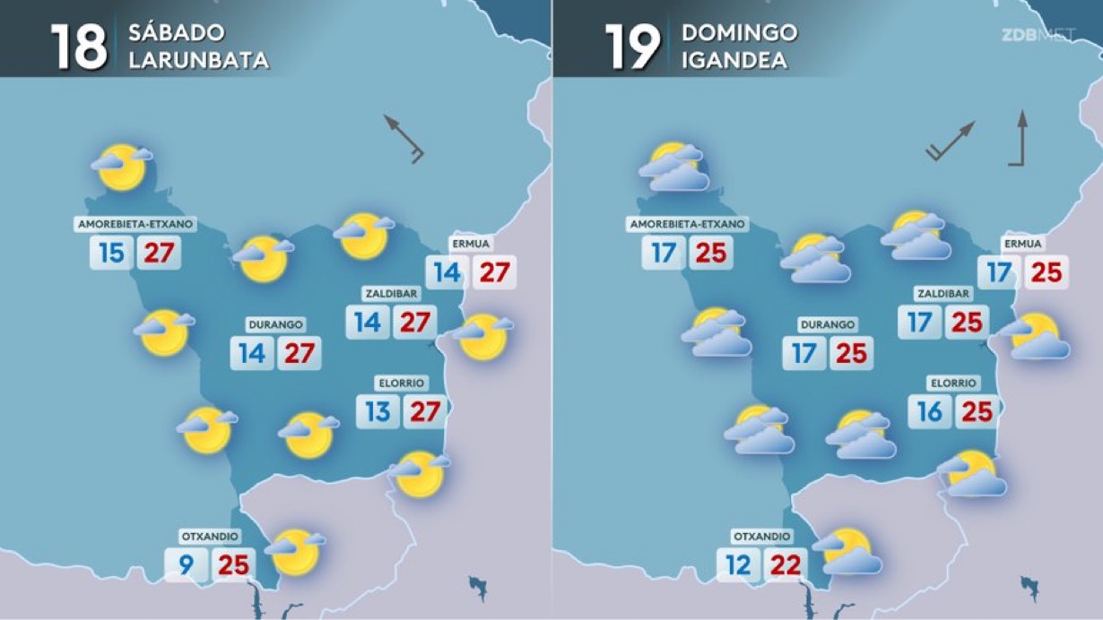 EGURALDIA | Larunbatean hego-haizea ibiliko da eta Kantauri isurialdeko giroak udako itxura hartuko du; Kantauri bailaretako zenbait tokitan maximoak 30 ºC-ren bueltan egon daitezke. Mediterraneo isurialdean ere igo daiteke tenperatura, baina maximoek berdintsu jarraituko dute orokorrean. Eguraldi eguzkitsua, goi-hodeiak ugaritu egingo diren arren, batez ere egunaren amaieran. Egunaren lehenengo partean Ebro ibarrean lainoguneak eta behe-hodeiak agertuko dira, arratsaldean jasoko du denean ziurrenik.