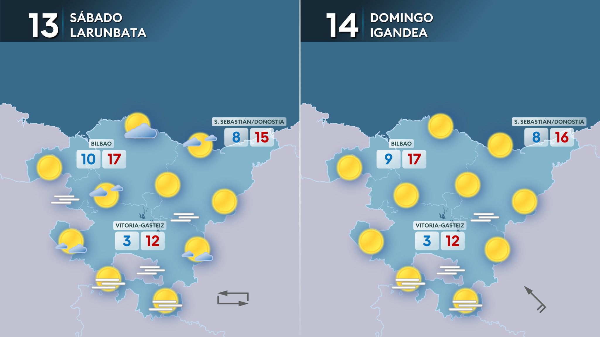 EGURALDIA | Larunbatean, oro har, giro eguzkitsua. Barnealdean, batez ere Arabako eta Nafarroako zenbait tokitan, behe-lainoa iraunkorra izan daiteke eta luze iraun dezake. Gainerakoan, hodei gutxi egongo da eta arratsaldetik aurrera behe-hodeiak edo lanbroa ager daiteke kostaldean. Tenperaturak gorabehera handirik gabe jarraituko du, maximoak igotzeko eta minimoak jaisteko joerarekin. Haize aldakorra ibiliko da, goizean hegoaldekoa nagusituko da eta arratsaldean iparraldekoa.