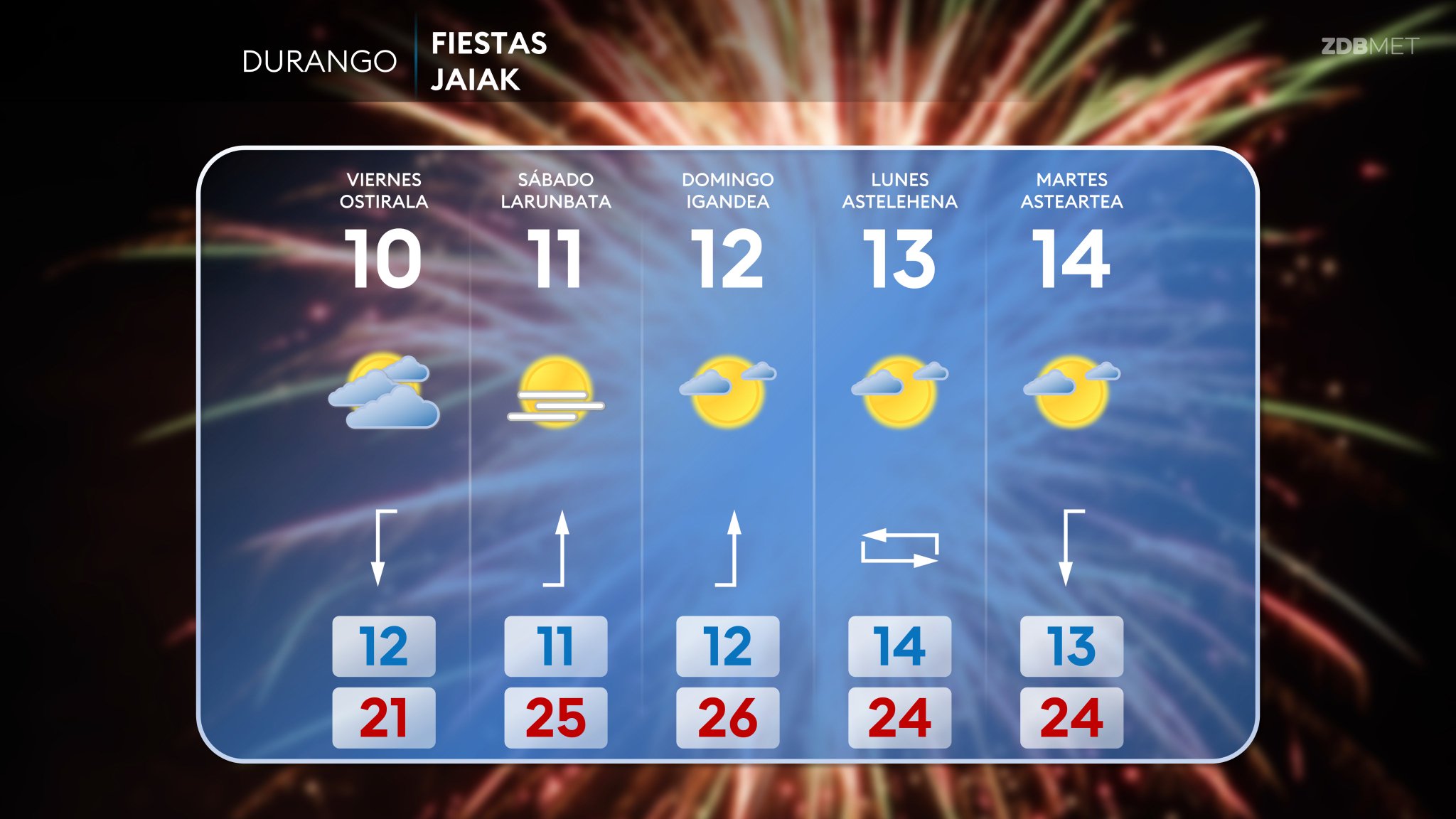 DURANGO | Herriak metxa piztuko du gaur arratsaldean, 20.00etan, txupinazoa jaurtiz. Aurretik, jai-egun asko, herritarrek eta bisitariek aukera izan dezaten horretarako antolatutako 160 jarduera baino gehiago gozatzeko. Zalantzarik gabe, meteorologia oso faktore garrantzitsua izan ohi da jaien garapenerako, eta jende asko zeruari begira egoten da. Orduan, zer eguraldi ez duzu espero gaur hasi eta astelehenera arte, San Fausto eguna Durangon? Badirudi eguraldi onak, eguzkiak eta beroak lagunduko dutela aurten ere jaien hasiera. Durango eta inguruetan “veroño” berri bat biziko da, egun eguzkitsuekin, 27 graduko maximoarekin eta euririk gabe. Oraingoz, eguraldiak datorren asteazkenera arte jarraituko du. Hurrengo eredu meteorologikoen zain egon beharko dugu, hurrengo asteburuan eguraldi horri eutsiko diogun ala ez ikusteko.